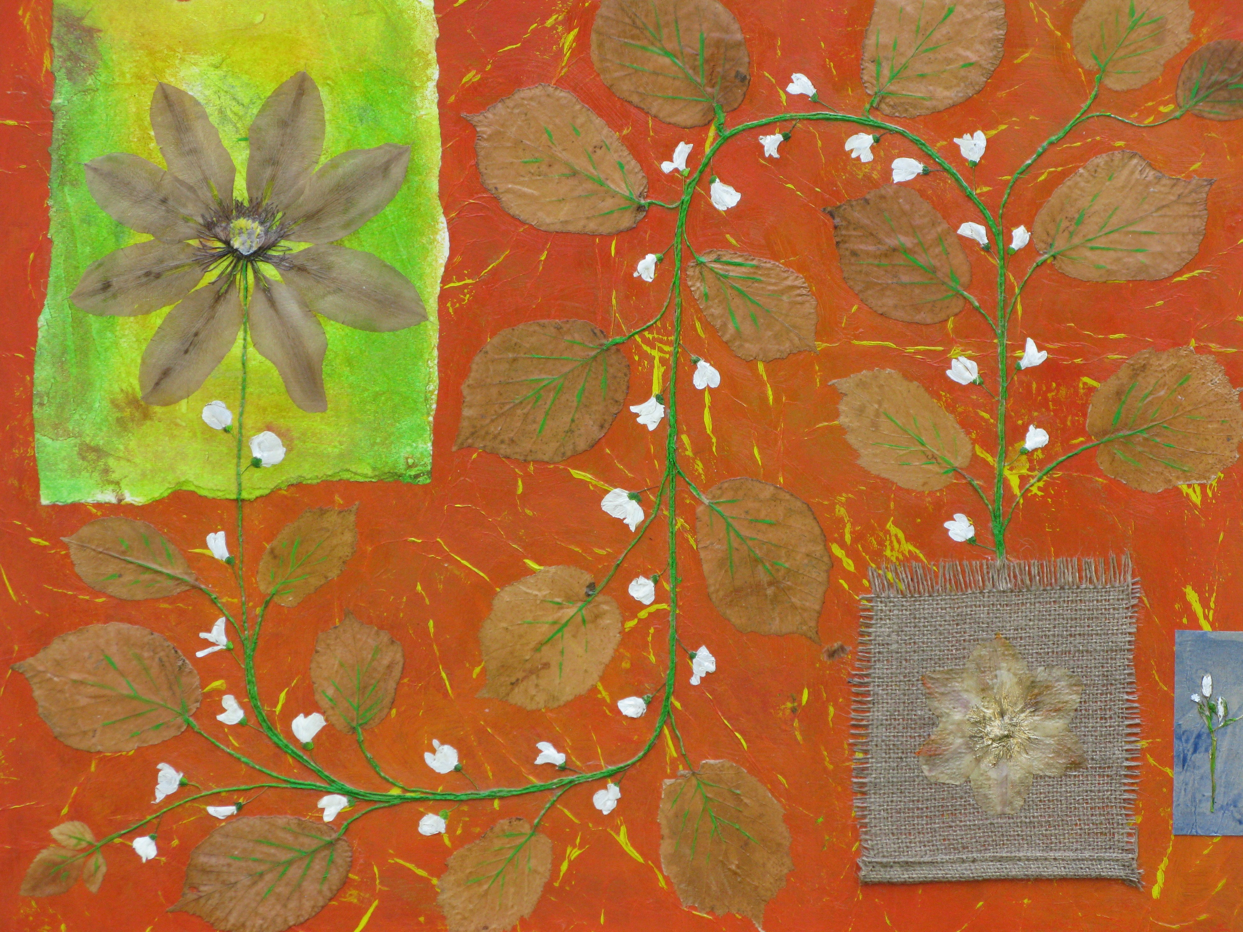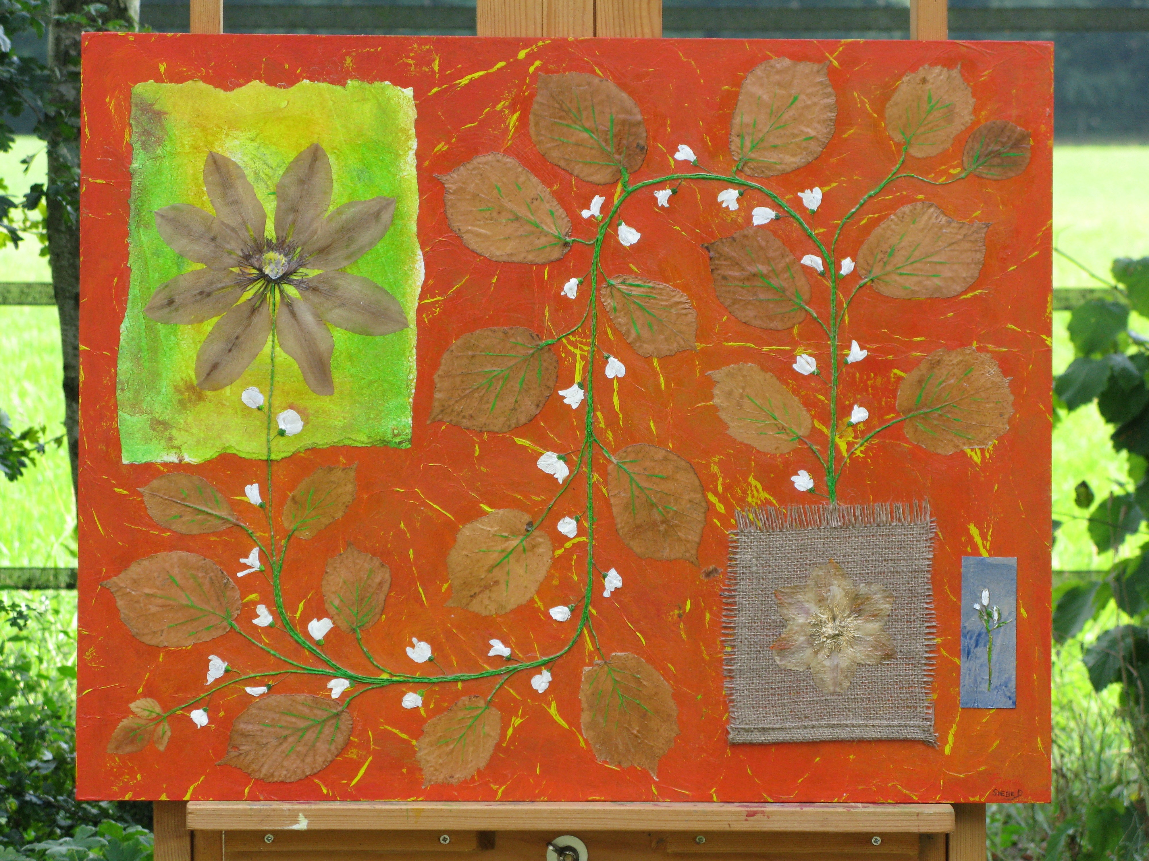 Beschrijving: Bloemen en jute op MDF. Afm. 70 x 55