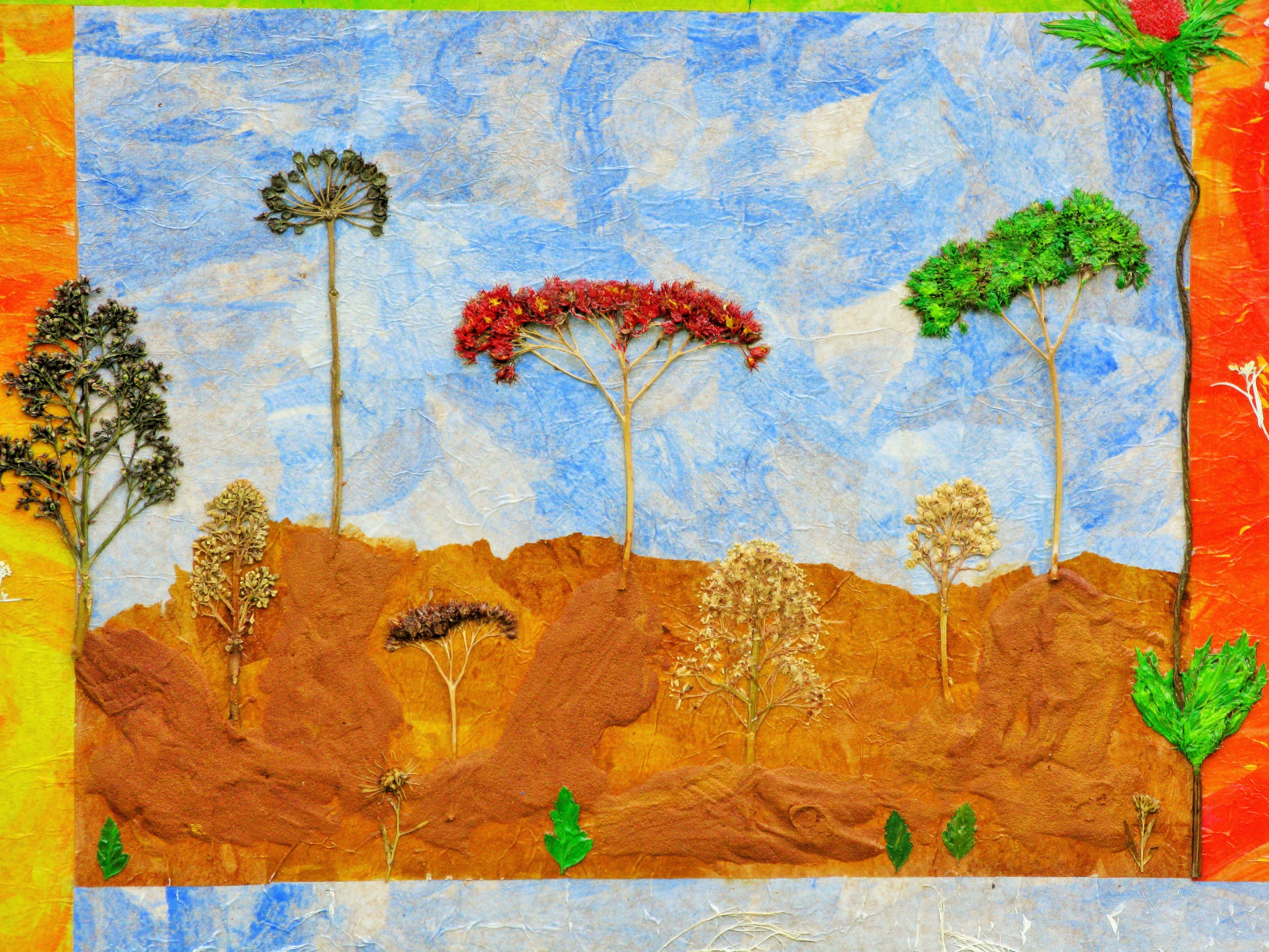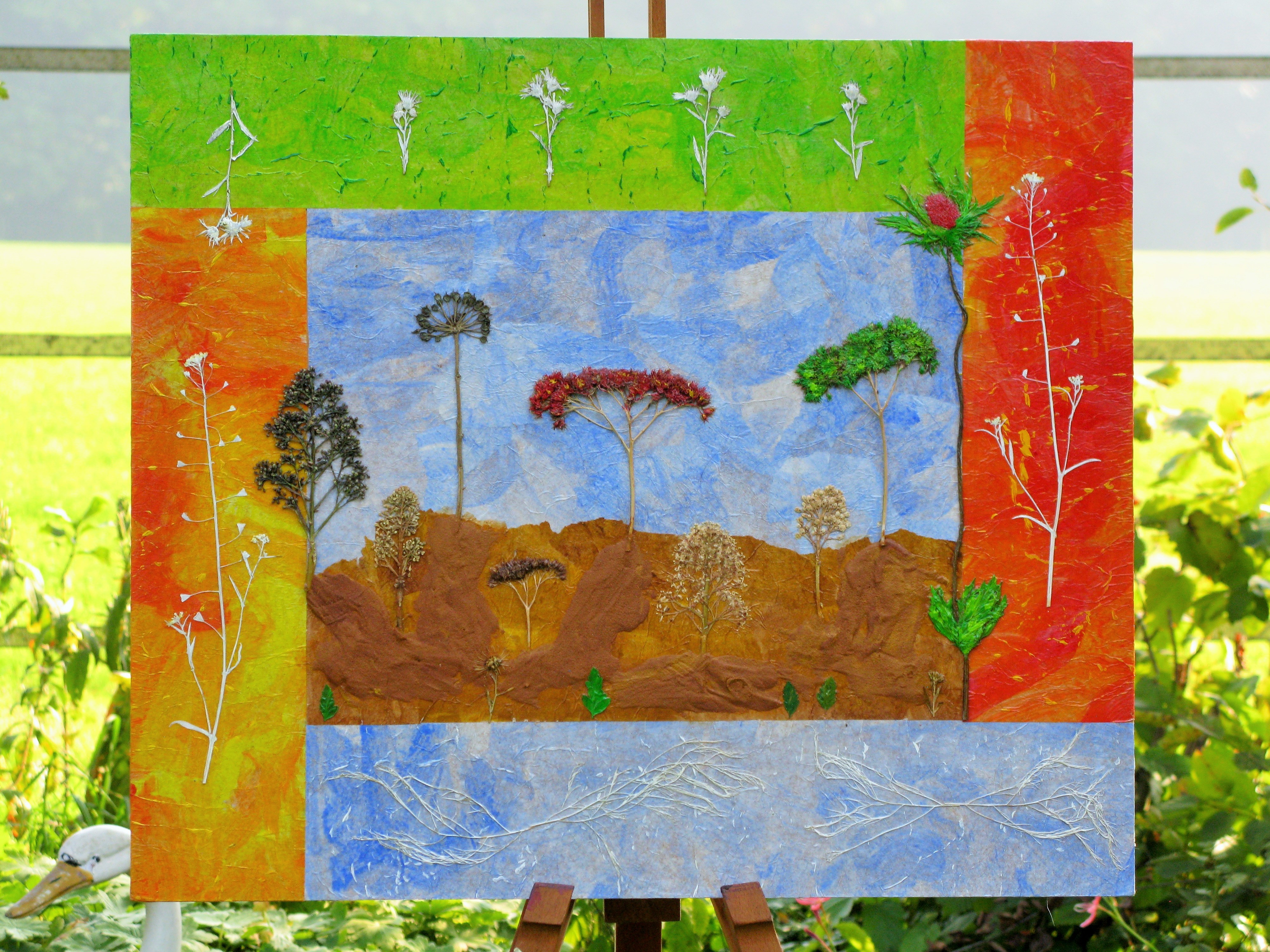 Beschrijving: Droogbloemen en zand op MDF Afm. 58 x 50 cm.