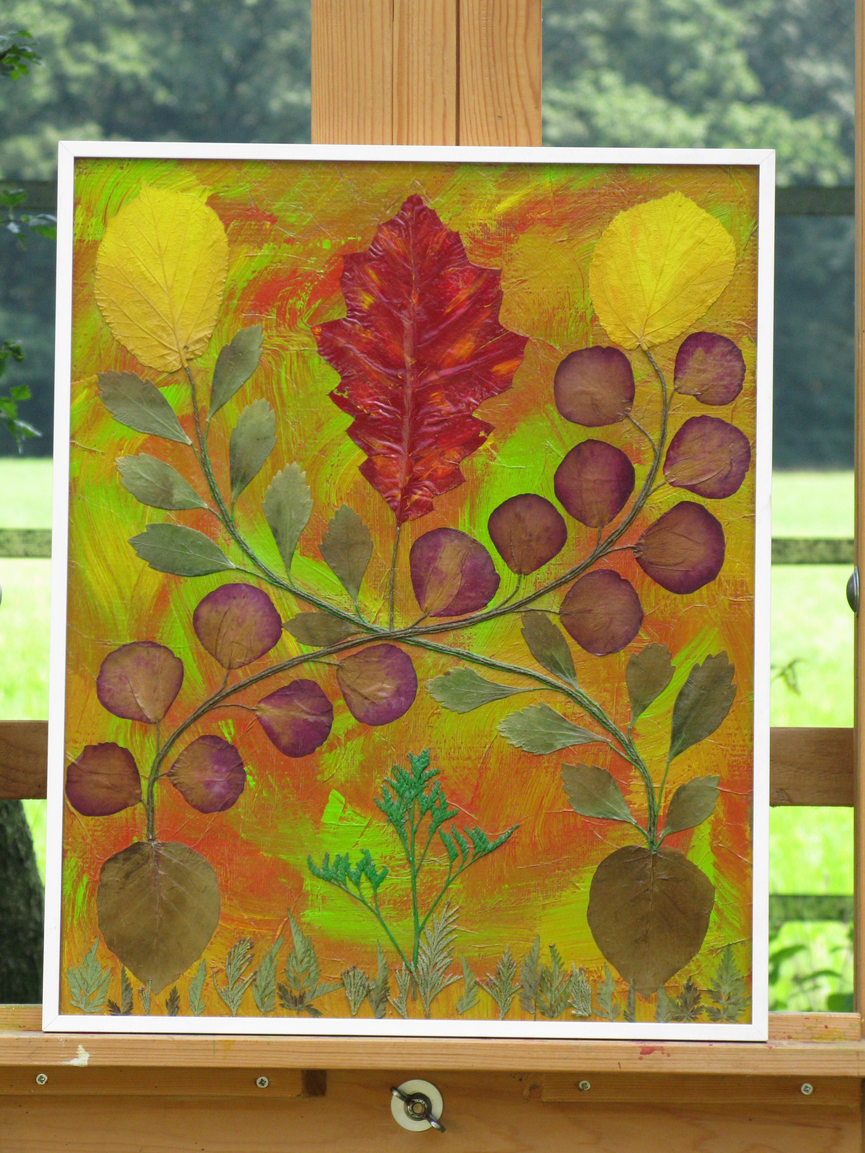 Beschrijving: Collage van gedroogde bloemen en bladeren hardboard. Afm. 40 x 50