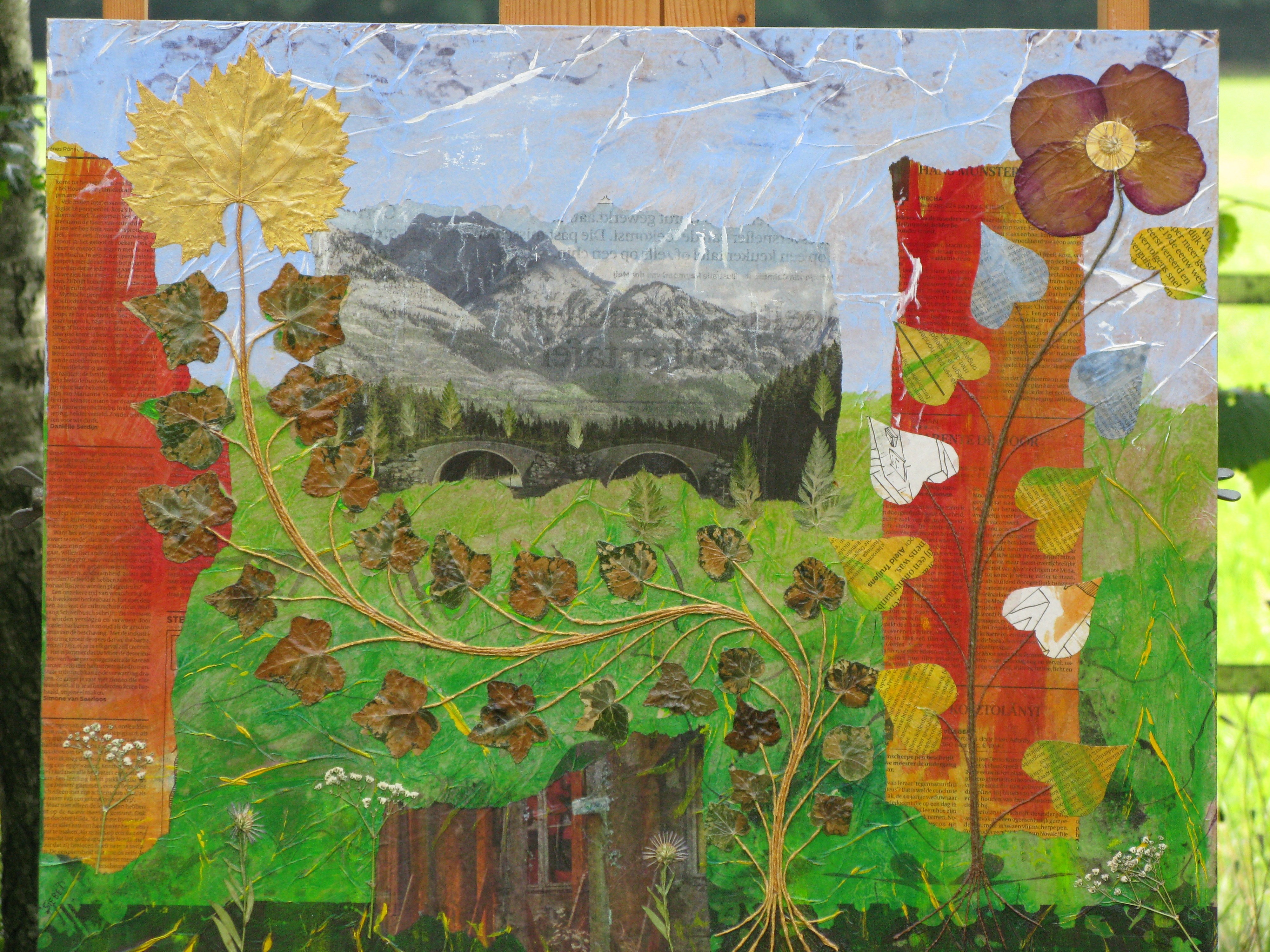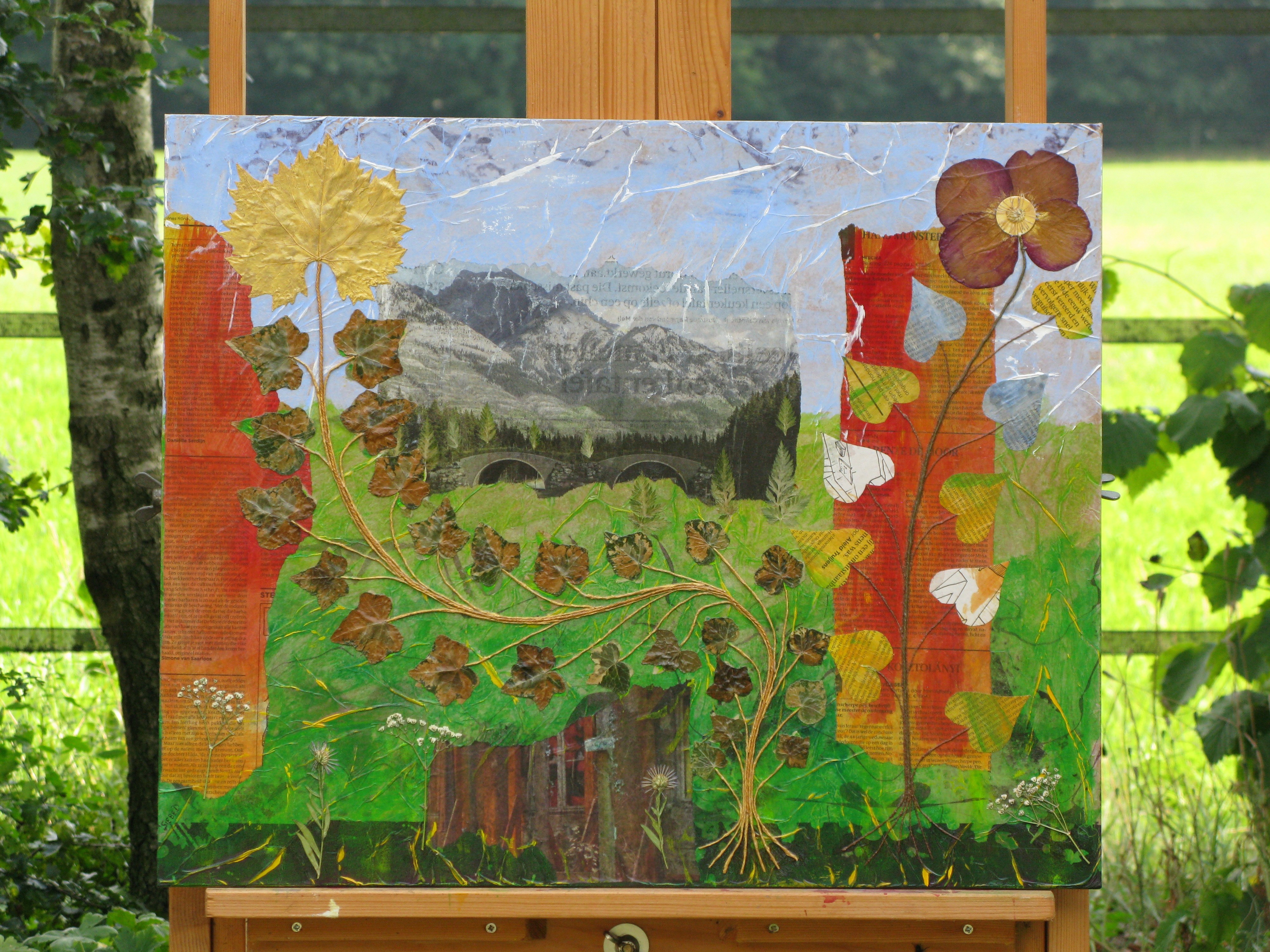 Beschrijving: Papier, bloemen en diverse materialen op MDF. Afm 50 x 60