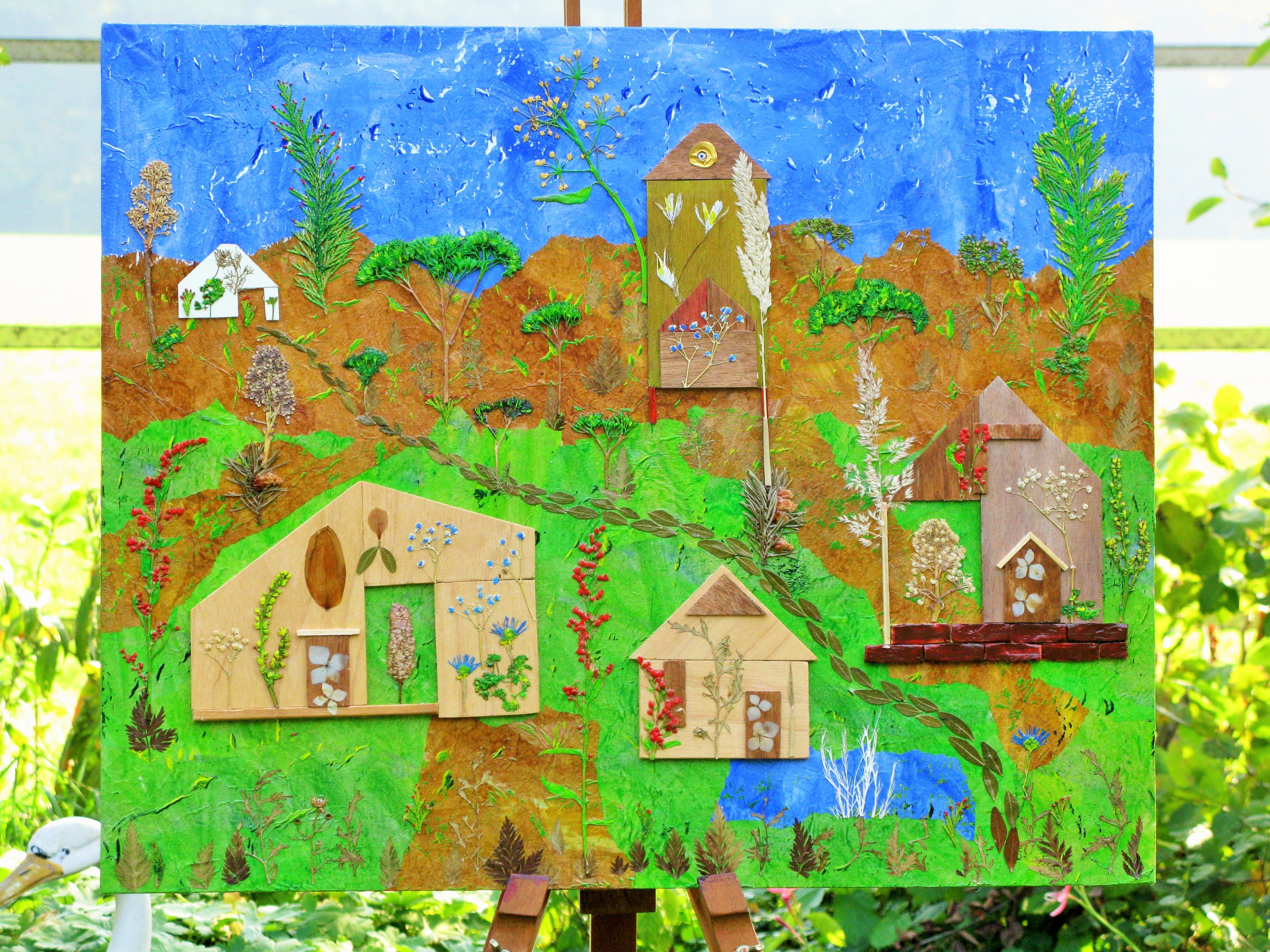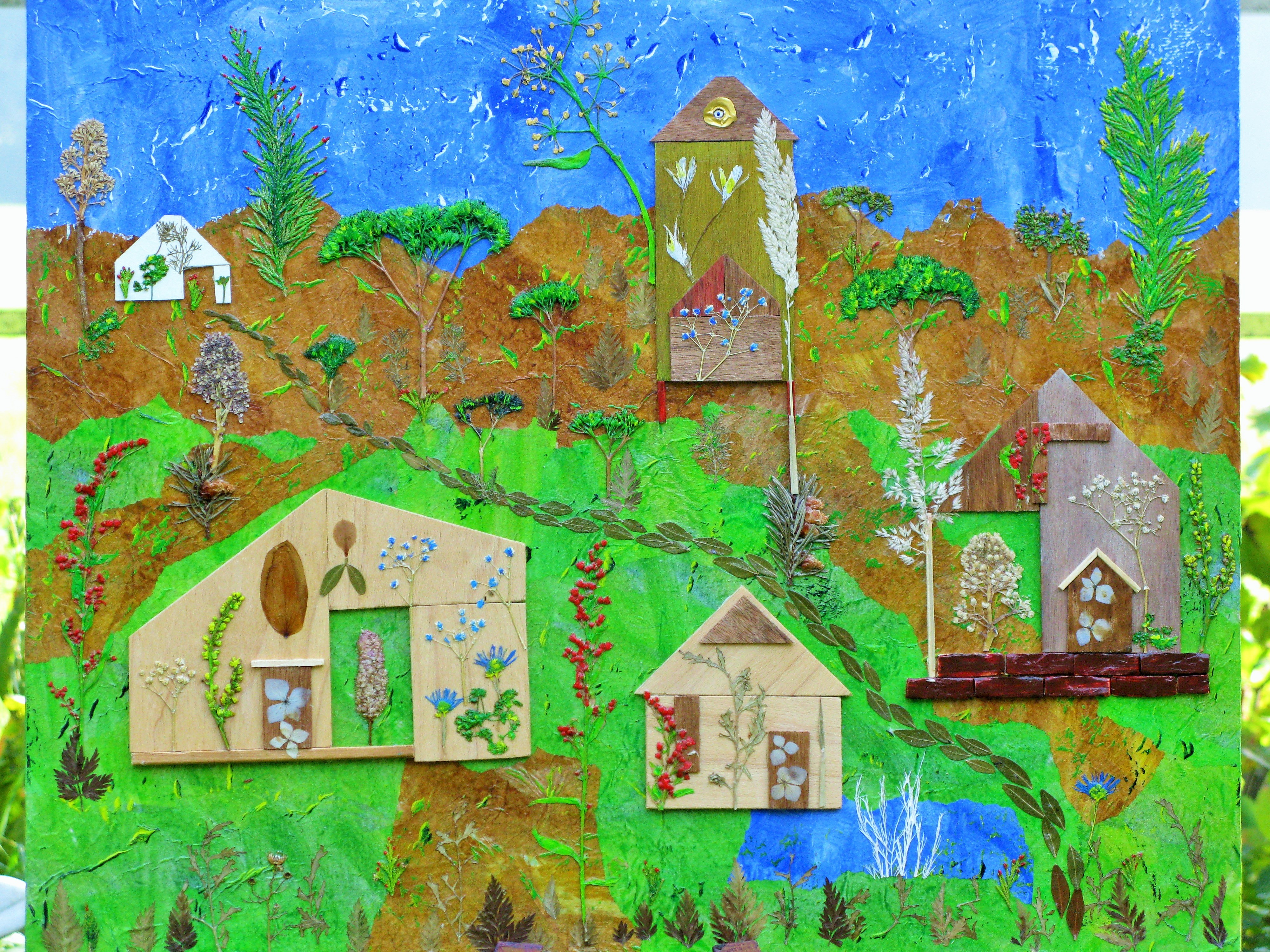 Beschrijving: Droogbloem en hout op MDF Afm. 61 x 50 cm. VERKOCHT