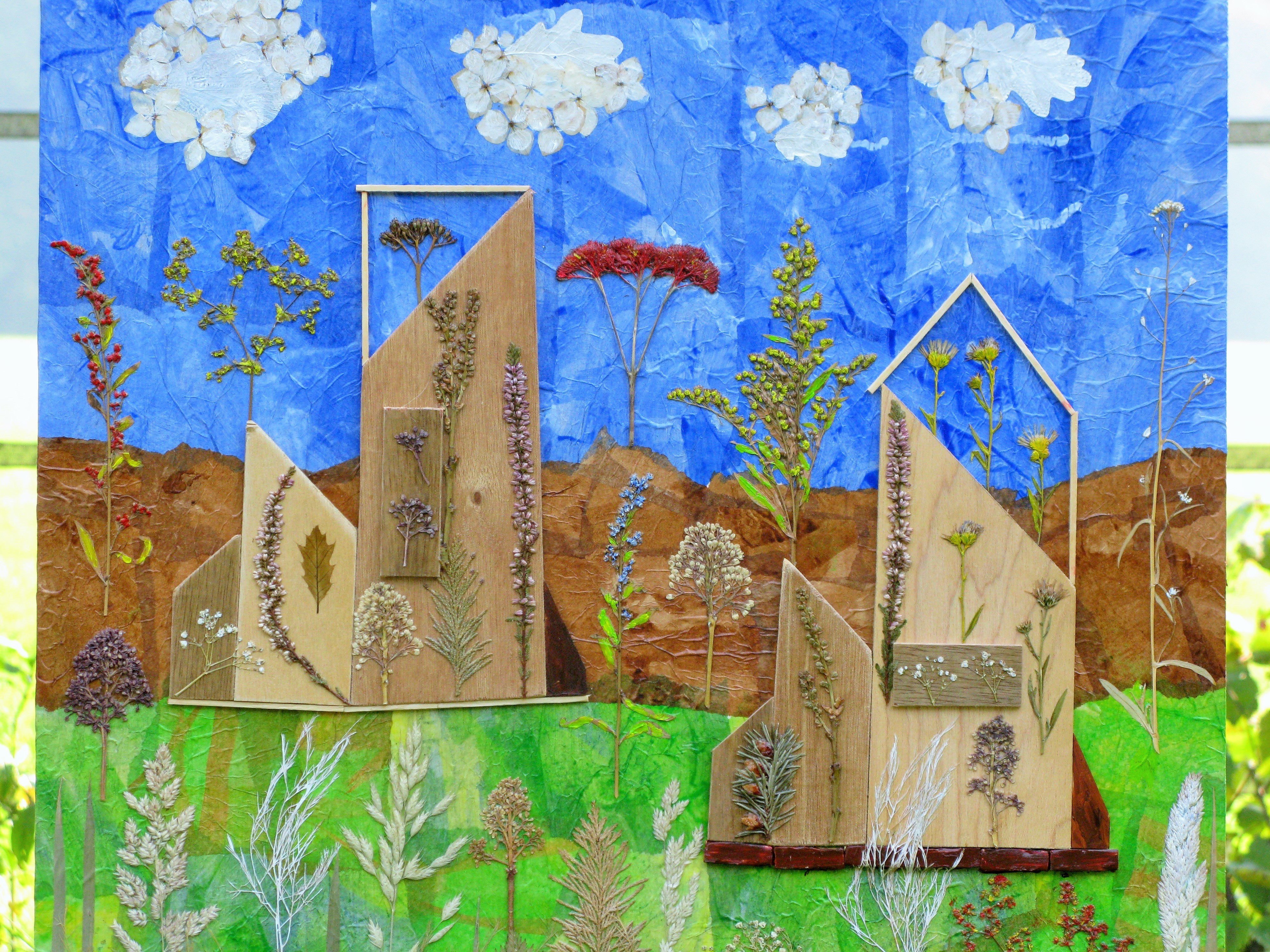 Beschrijving: Droogbloemen en diverse materialen op MDF Afm. 63 bij 41 cm.